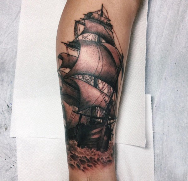 纹身小帆船 男生小腿上黑色的帆船纹身图片