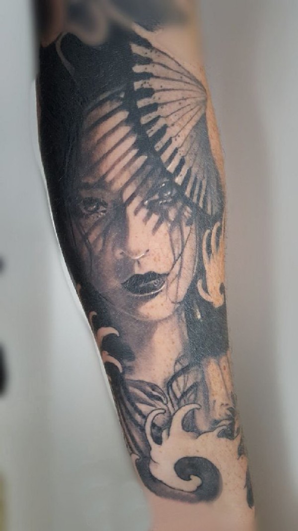 纹身日本艺妓图片 男生手臂上黑灰的人物艺妓纹身图片
