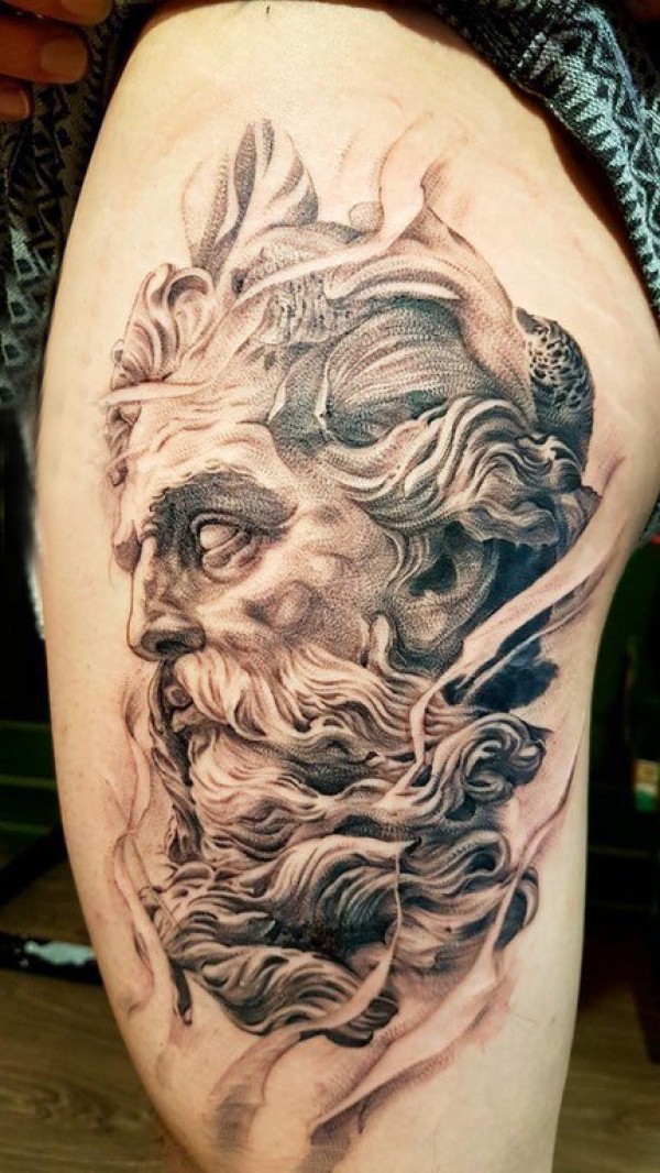 纹身神话人物 女生大腿上黑色的希腊神话人物纹身图片