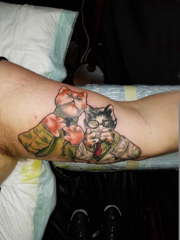 小猫咪纹身 男生大臂上彩色的猫咪纹身图片