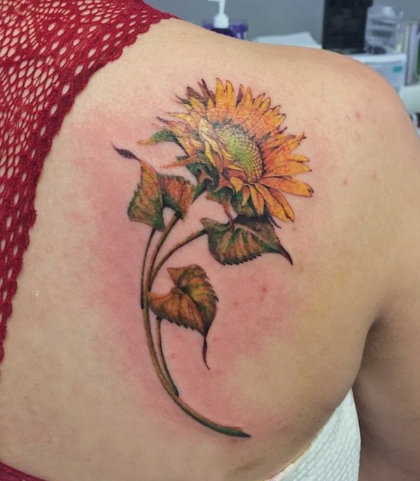 向日葵纹身图片 女生后背上彩色的向日葵纹身图片