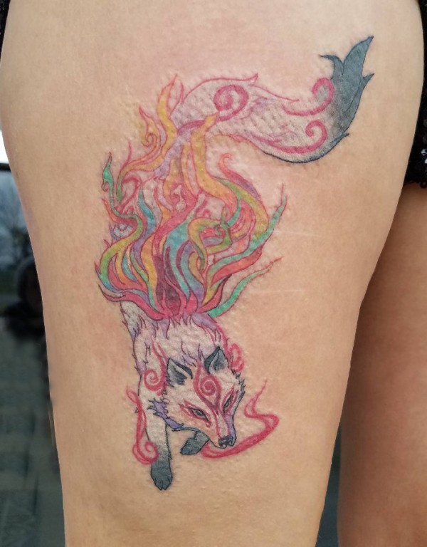 九尾狐狸纹身 女生大腿上彩色的狐狸纹身图片