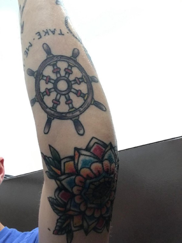 无上船舵纹身 男生手臂上彩色的船舵纹身图片