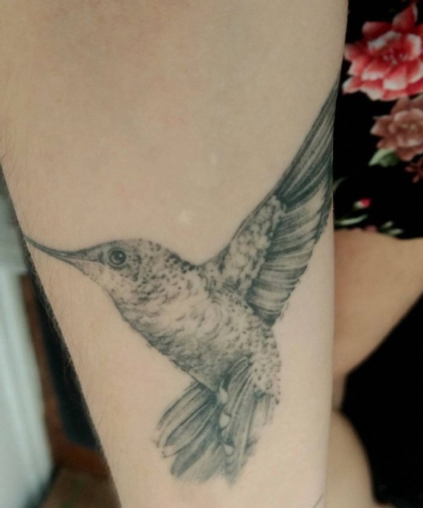 纹身鸟 女生大腿上黑灰的蜂鸟纹身图片