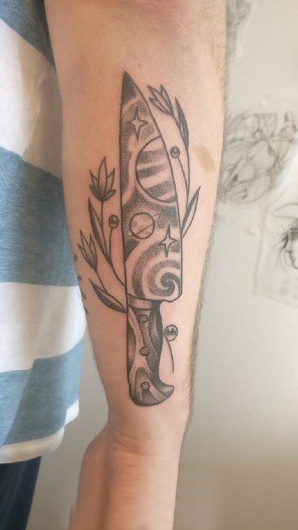 欧美匕首纹身 男生手臂上植物和匕首纹身图片