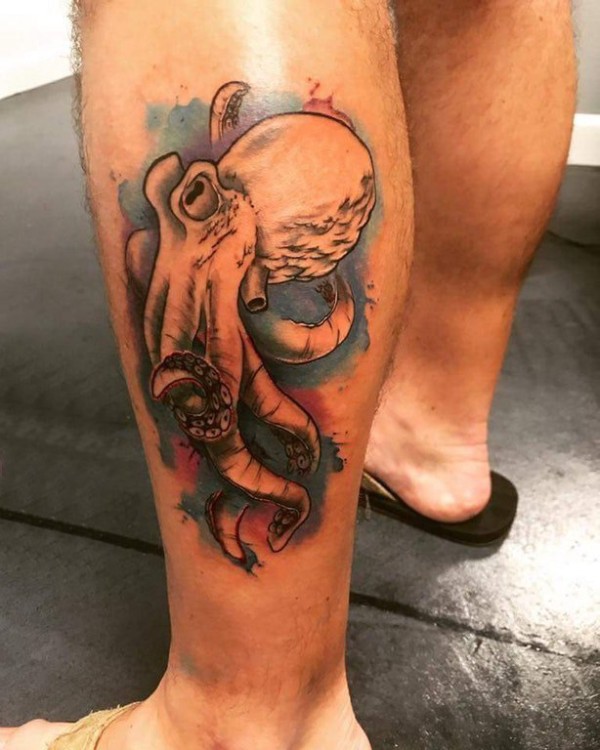 章鱼纹身 男生小腿上彩色的章鱼纹身图片