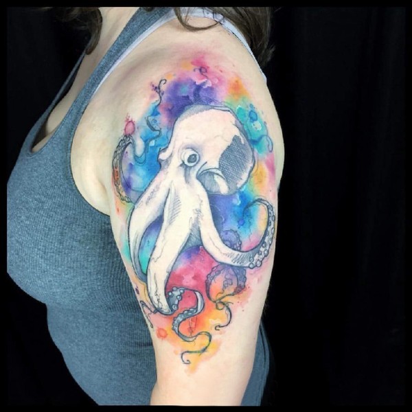 章鱼纹身简单 女生大臂上彩色的章鱼纹身图片