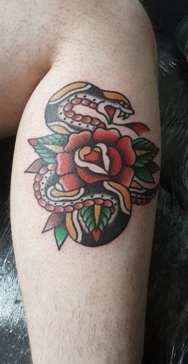 蛇和花朵纹身图案 男生小腿上蛇和花朵纹身图片