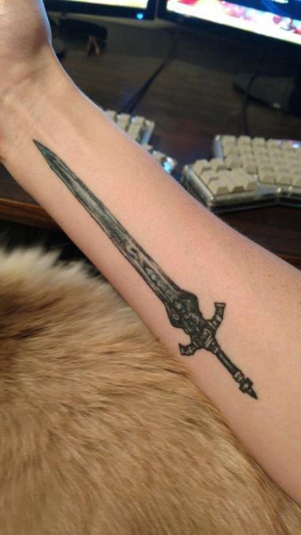 宝剑纹身 男生手臂上黑色的宝剑纹身图片