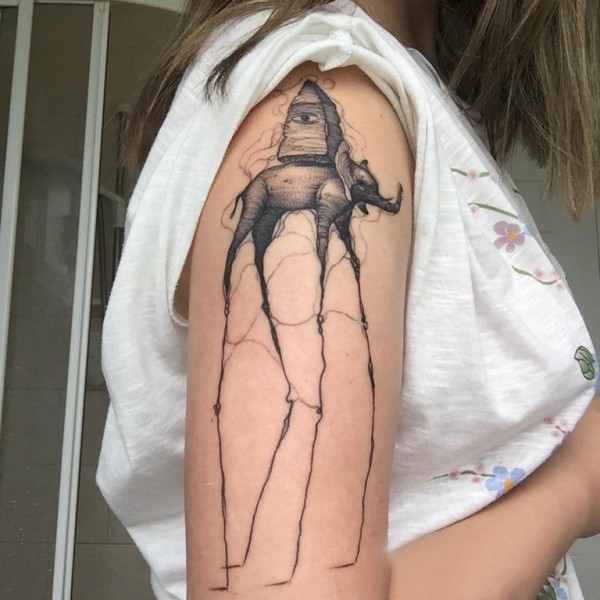 大象纹身 女生大臂上黑色的大象纹身图片