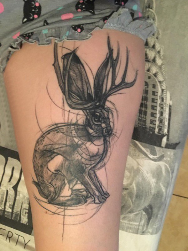 垂耳兔子纹身 女生大腿上黑色素描兔子纹身图片