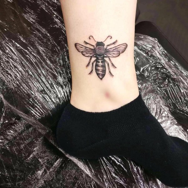 小蜜蜂纹身 女生脚踝上黑色的蜜蜂纹身图片