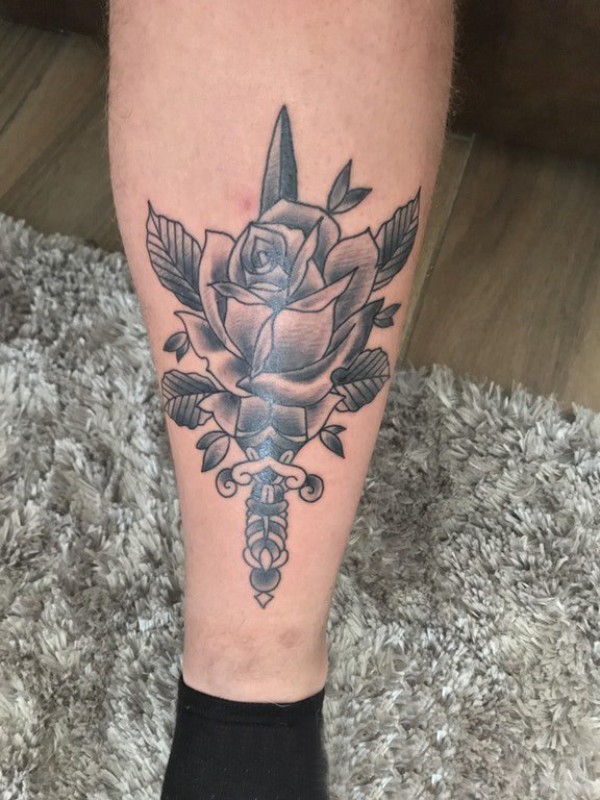 匕首纹身 女生小腿上匕首纹身玫瑰花图片