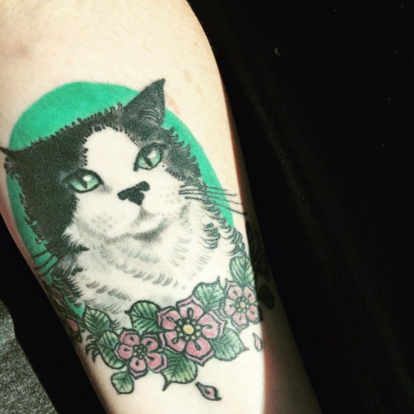 小清新猫咪纹身 男生手臂上花朵和小猫咪纹身图片