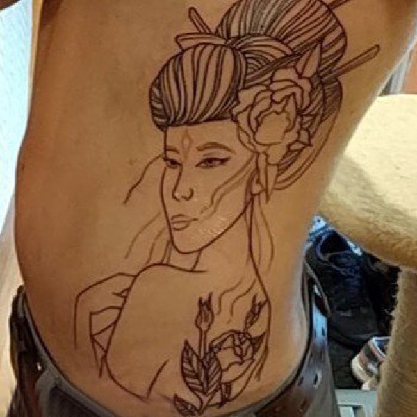纹身艺妓素材 男生侧腰上人物肖像艺妓纹身图片
