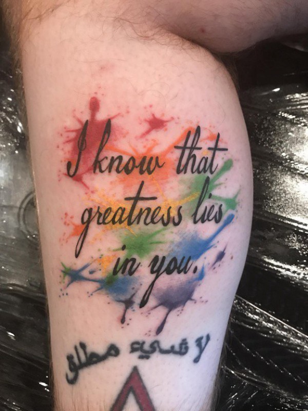 花体英文纹身 男生小腿上彩色的英文纹身图片