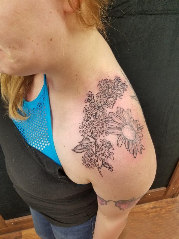 文艺花朵纹身 女生肩部黑色的花朵纹身图片