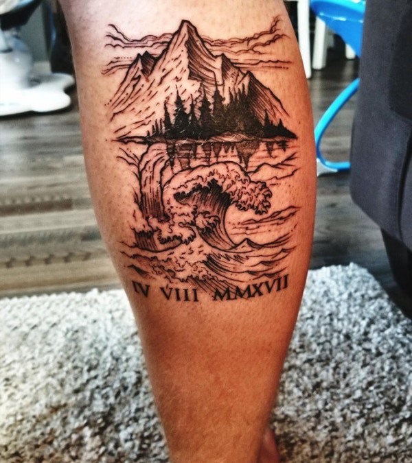 山水纹身图案 男生小腿上山水纹身图案