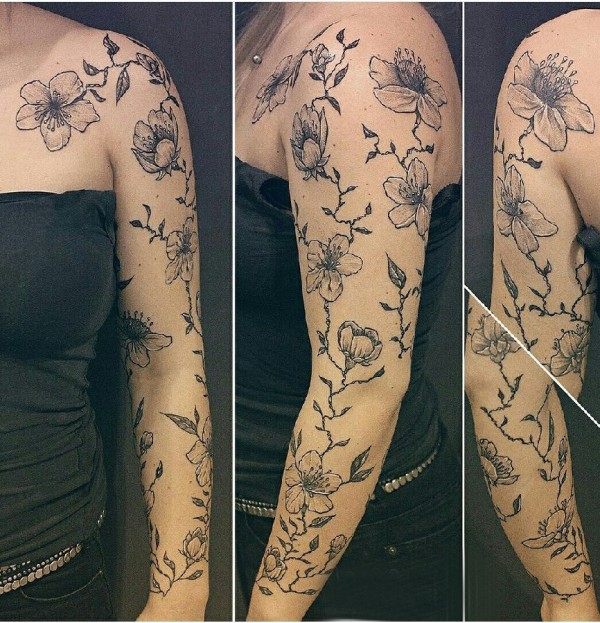 欧美花臂纹身 女生手臂上黑色花朵纹身图片