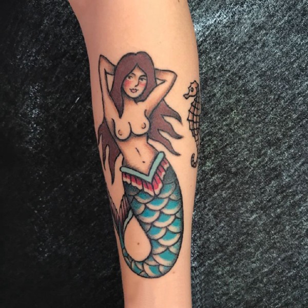 美人鱼花臂纹身 女生手臂上彩色的美人鱼纹身图片