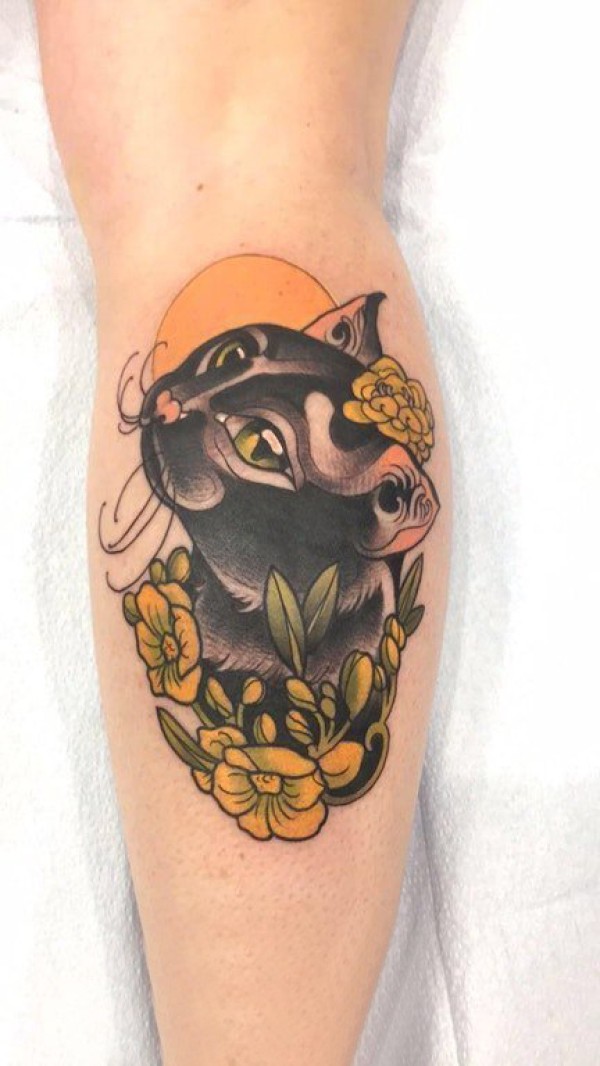 公牛头纹身 男生小腿上花朵和牛纹身图片