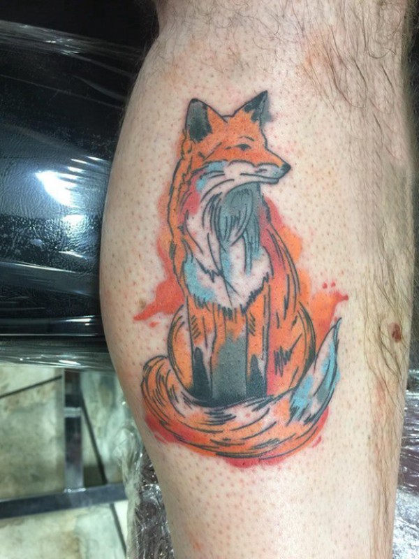 彩色狐狸纹身 男生小腿上彩色的狐狸纹身图片