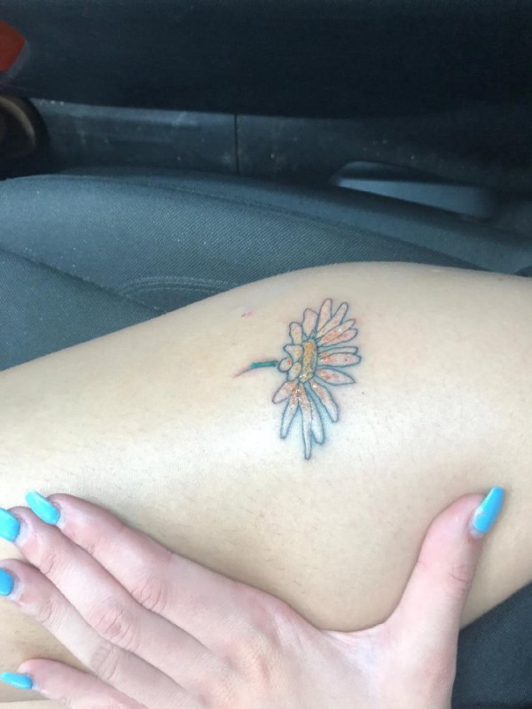 小雏菊纹身 女生大腿上彩色的雏菊纹身图片