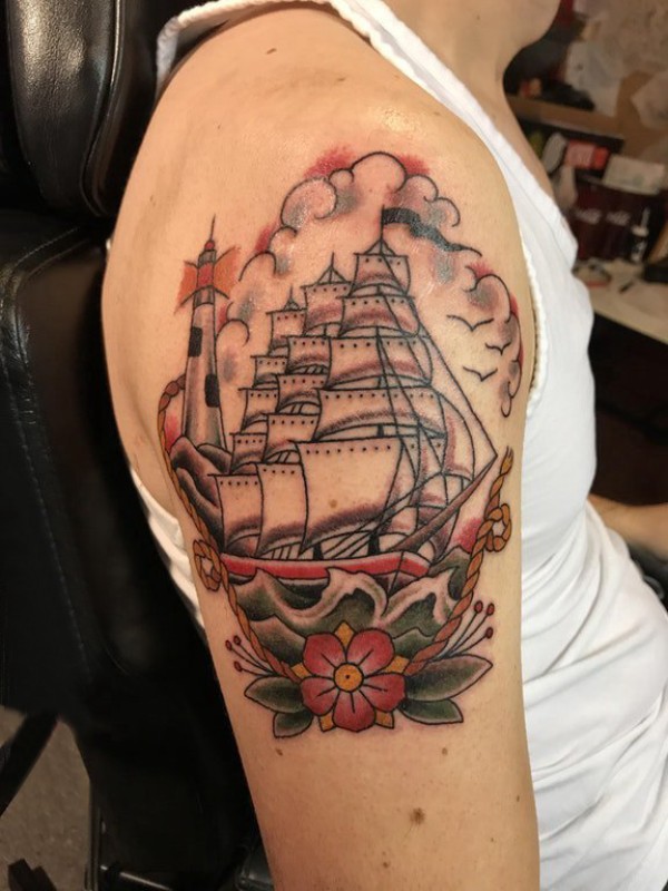 纹身小帆船 男生大臂上彩色的帆船纹身图片