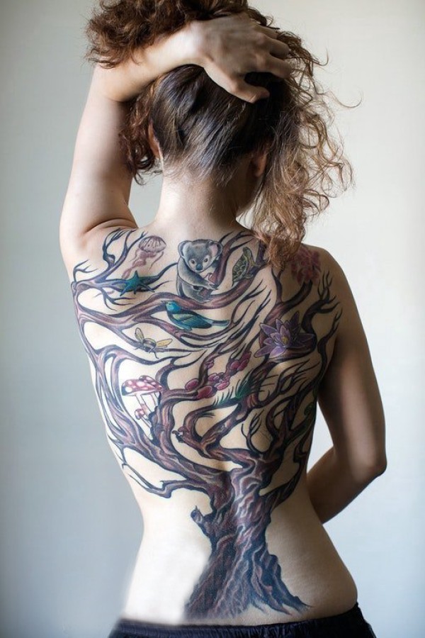 生命树纹身素材 女生后背上彩色的生命树纹身图片
