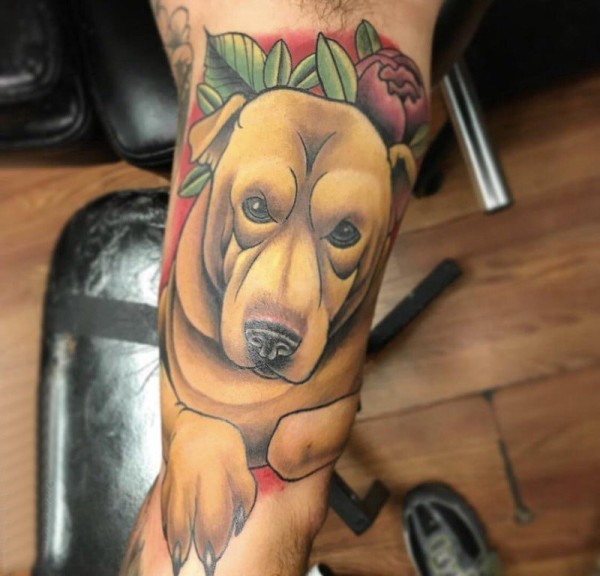 小狗纹身图片 男生手臂上彩色小狗纹身图片