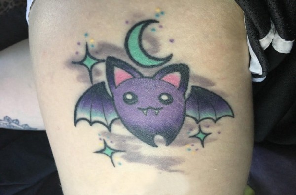 纹身卡通 男生大臂上彩色的卡通蝙蝠纹身图片