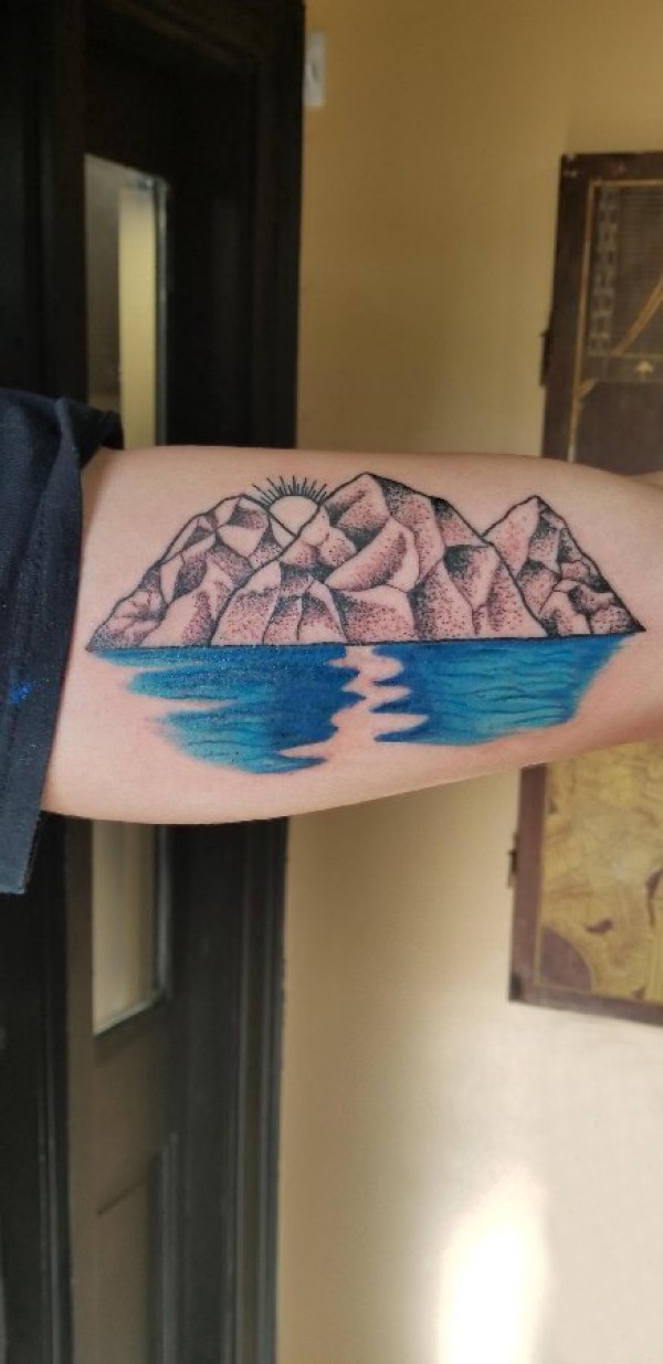 手臂山水纹身 男生手臂上彩色的山水纹身图片