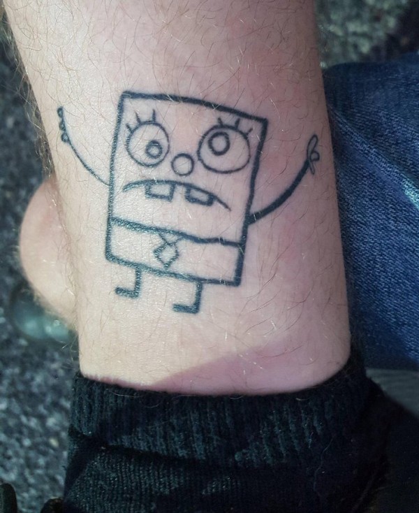 海绵宝宝纹身 男生小腿上黑色的海绵宝宝纹身图片