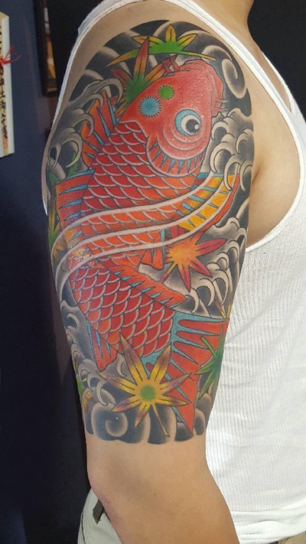 大臂锦鲤纹身 男生大臂上彩色的锦鲤纹身图片