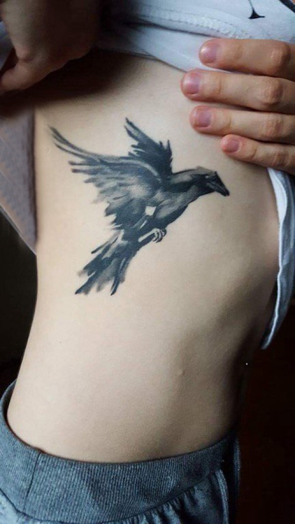 纹身鸟 女生侧腰上黑色的小鸟纹身图片