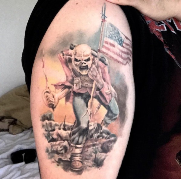 美国士兵纹身 男生大臂上彩色的骷髅美国士兵纹身图片