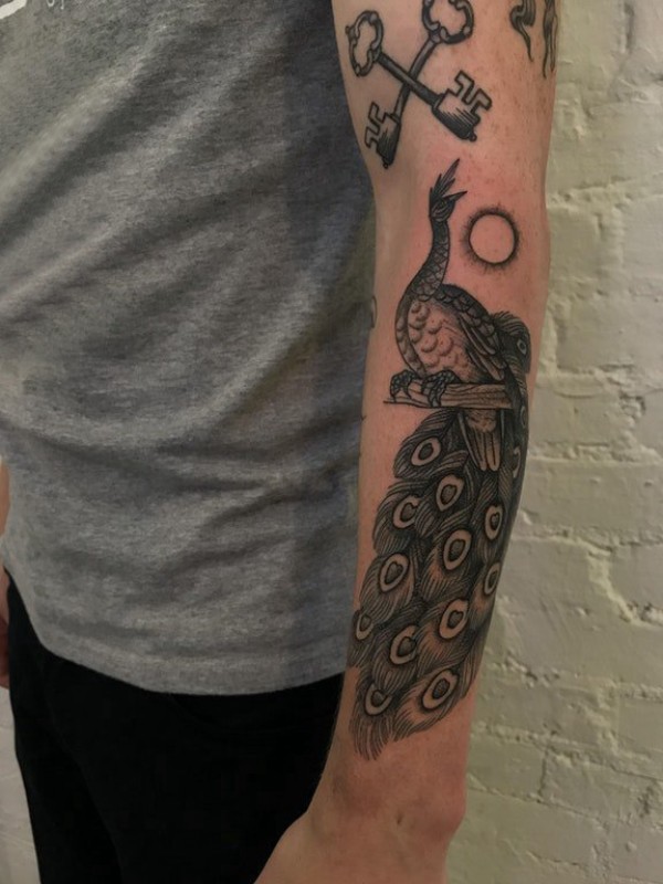 孔雀毛纹身 男生手臂上黑色的孔雀纹身图片