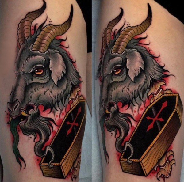 小山羊纹身 男生大腿上彩色的山羊纹身图片
