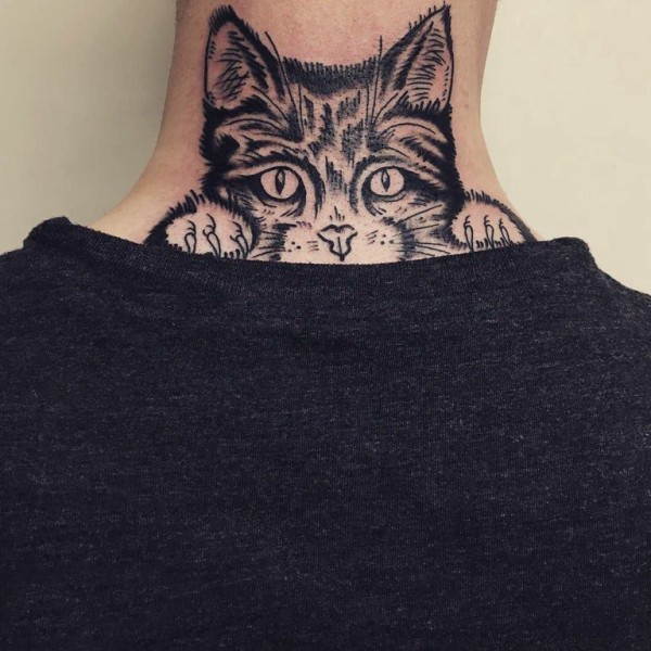 小猫咪纹身 男生颈后黑色的猫咪纹身图片