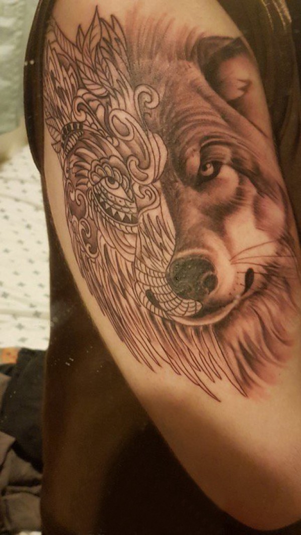 纹身狼头 男生手臂上黑色纹身狼头图片
