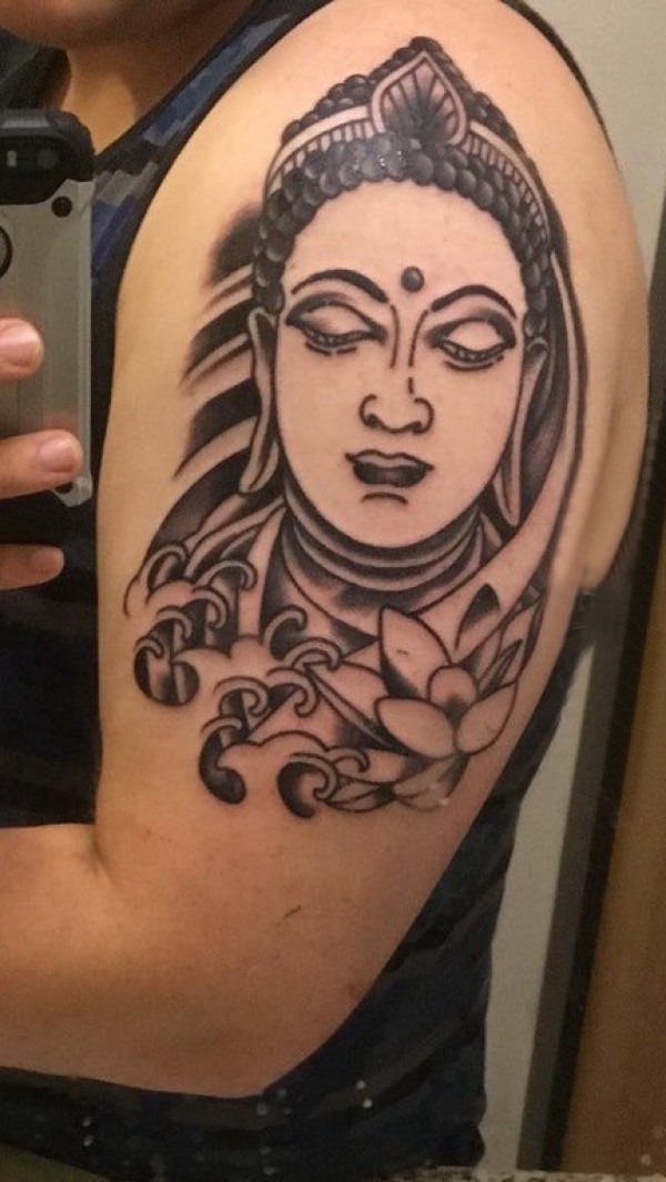 纹身佛像图 男生大臂上莲花和佛像纹身图片