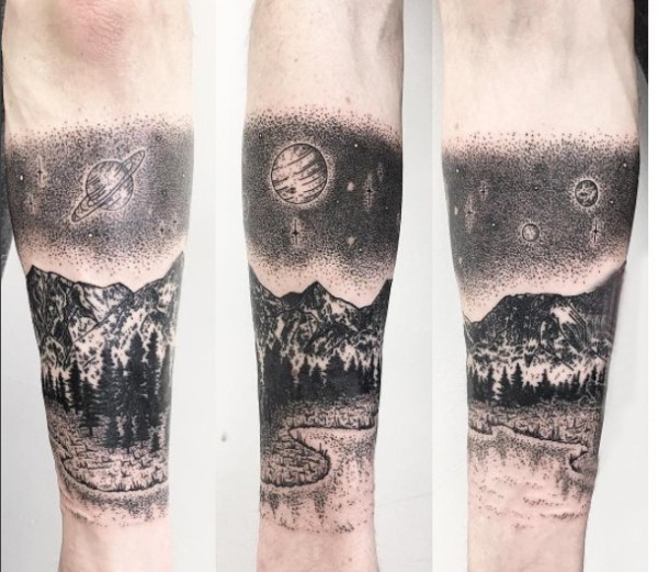 纹身风景 男生手臂上黑色的山水风景纹身图片