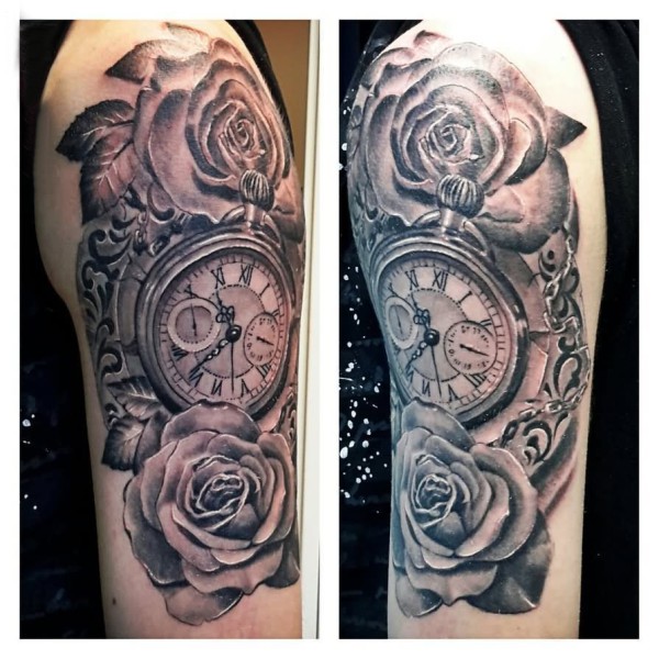 玫瑰纹身钟表 男生手臂上玫瑰纹身钟表图片