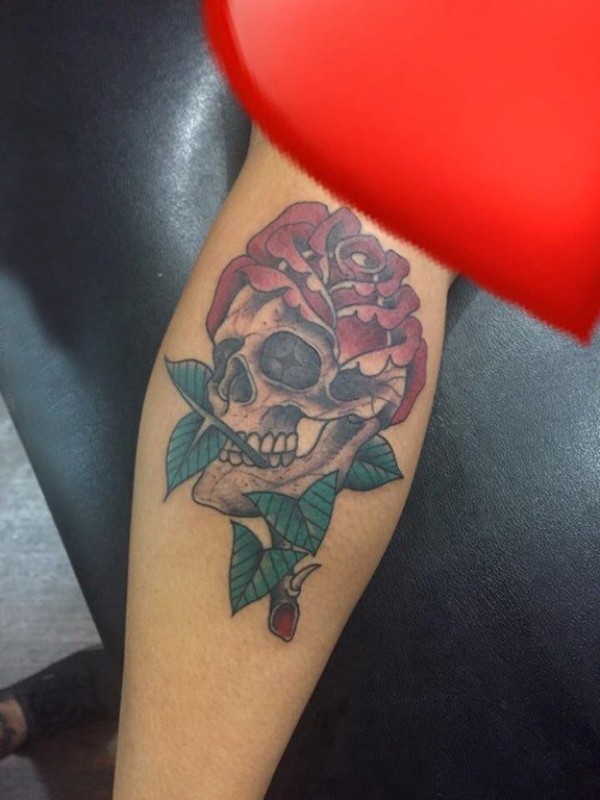 骷髅花朵纹身图案 女生手臂上骷髅花朵纹身图案