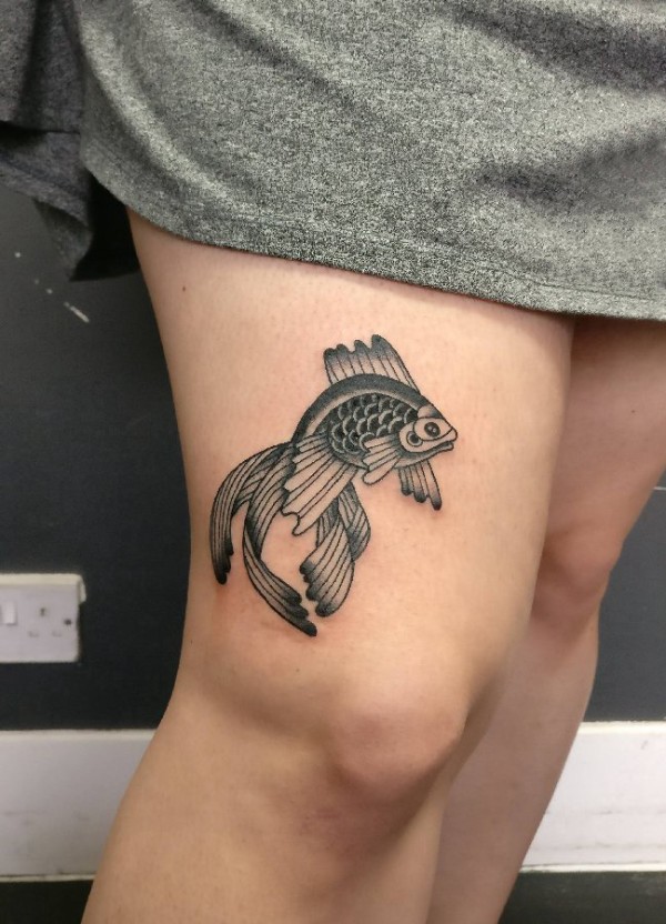 水墨金鱼纹身 女生大腿上黑色的金鱼纹身图片