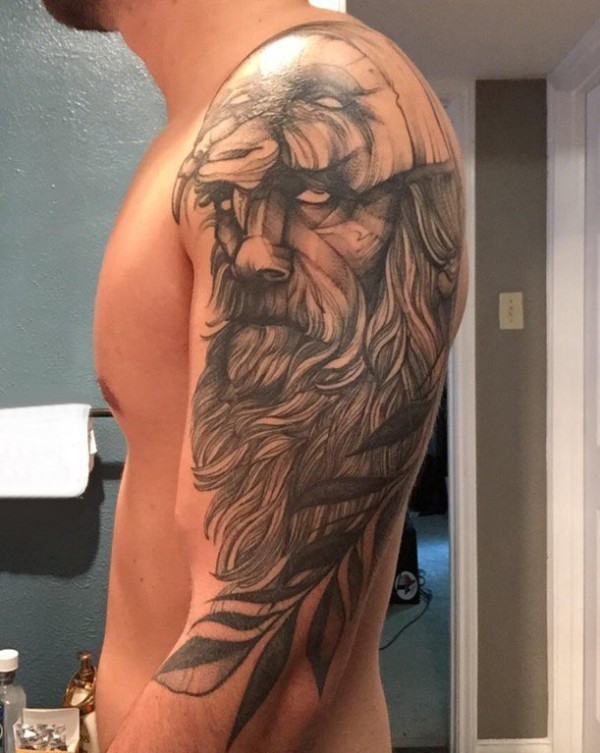 人物肖像纹身 男生大臂上黑灰人物肖像纹身图片