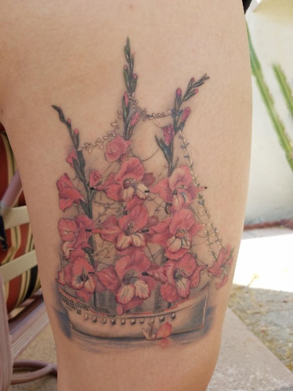 大腿纹身图女 女生大腿上花朵和帆船纹身图片
