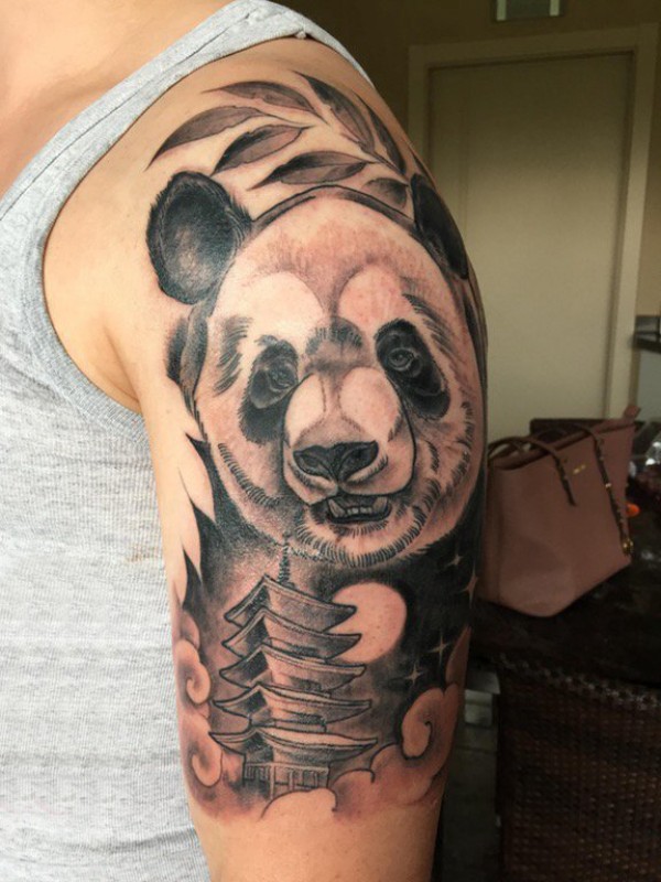 熊猫纹身图 男生大臂上黑色的熊猫纹身图片