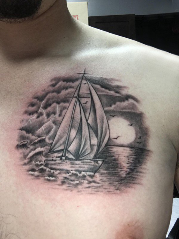 纹身小帆船 男生胸部黑色的帆船纹身图片