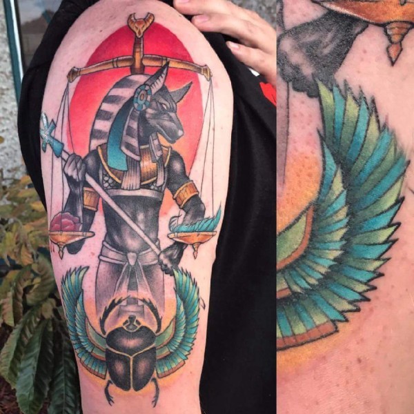 古埃及纹身 男生大臂上彩色的阿努比斯纹身图片
